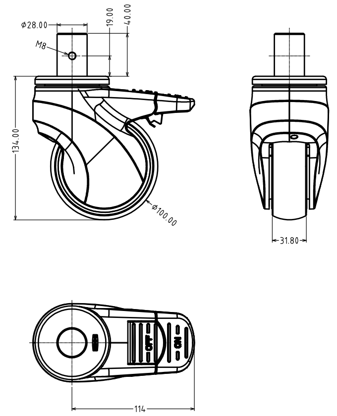 100 mm ABS Covered Medical Caster with stem rod with brake Price:¥ Id:M20-SR-B-100-ZG